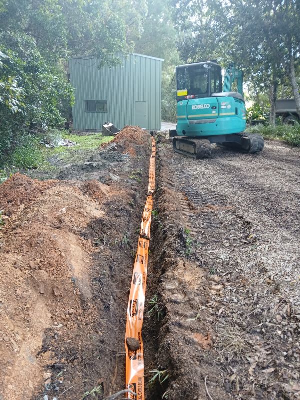 Running underground sub-mains involves the installation of mechanically protected cabling through conduit, which must be trenched at the correct depth and backfilled appropriately. On rural properties, this often necessitates collaboration with an earthworks contractor for the trenching process. The electrical connections at both ends, including those at the main switchboard and the shed sub-board, must be executed by licensed electrical professionals. We manage the entire process, overseeing earthworks and installations, so you only need to communicate with one point of contact instead of juggling multiple trades, which makes the project more streamlined and efficient.